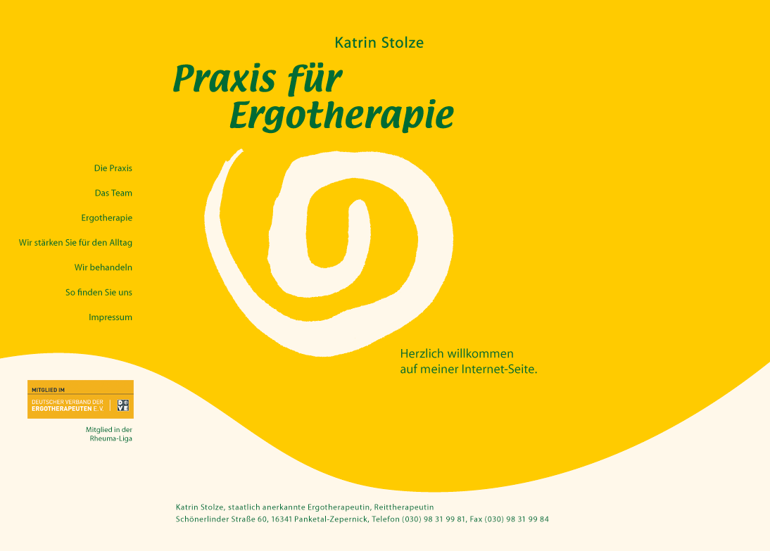 Die Webseite der Praxis für Ergotherapie von Katrin Stolze stellt Praxis und Team vor, informiert über Behandlungsinhalte, -ablauf, Öffnungszeiten und Anfahrt. Ausführung: Die Seite ist statisch in HTML umgesetzt, dient ausschließlich der Vorabinformation und verzichtet daher auf User-Interaktion. Eckdaten: 8 Haupt-, 5 Subseiten; CSS In Zusammenarbeit mit: Anke am Berg (Konzept und Design) |