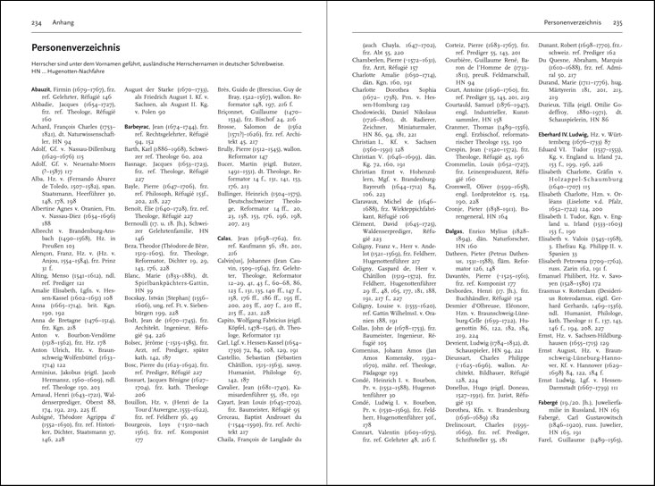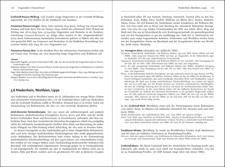 Das Buch wartet mit einem umfassenden Überblick des Themas auf, vom Beginn der calvinischen Reformation über die Flucht der Hugenotten aus Frankreich bis zu ihrem Wirken in aller Welt, ergänzt durch zahlreiche Abbildungen und Karten, eine Zeittafel, ein Begriffslexikon, einen weltweiten hugenottischen Reiseführer sowie u.a. Literatur-, Personen- und Ortsverzeichnis. Ausführung: Die enorme Fülle des vielfältig strukturierten Materials erforderte etliche unterschiedliche Textformate. Auch im Detail bedingte es die komplexe Textstruktur, nahezu sämtliche Möglichkeiten der Textauszeichnung auszuschöpfen (Kursiva, Kapitälchen, Fettsatz, Sperrungen, Schriftmischungen), um dem Leser letztlich ein optisch gut gegliedertes, übersichtliches Werk in die Hand zu geben. Eckdaten: 15,5 × 23 cm, 248 Seiten, ca. 50 Abb. und Karten Auftraggeber: Evangelische Verlagsanstalt Stimmen: „Dank der schönen Buchgestaltung …“ (‹kulturbuchtipps.de› am 22. Mai 2009) |
