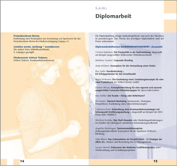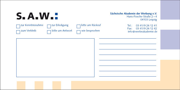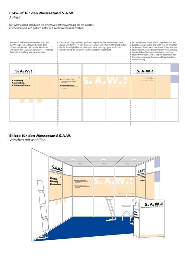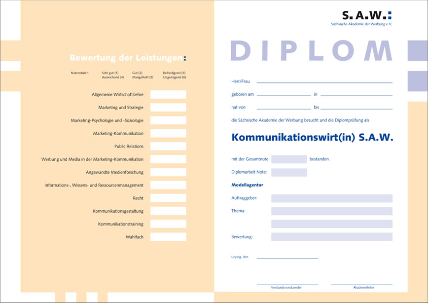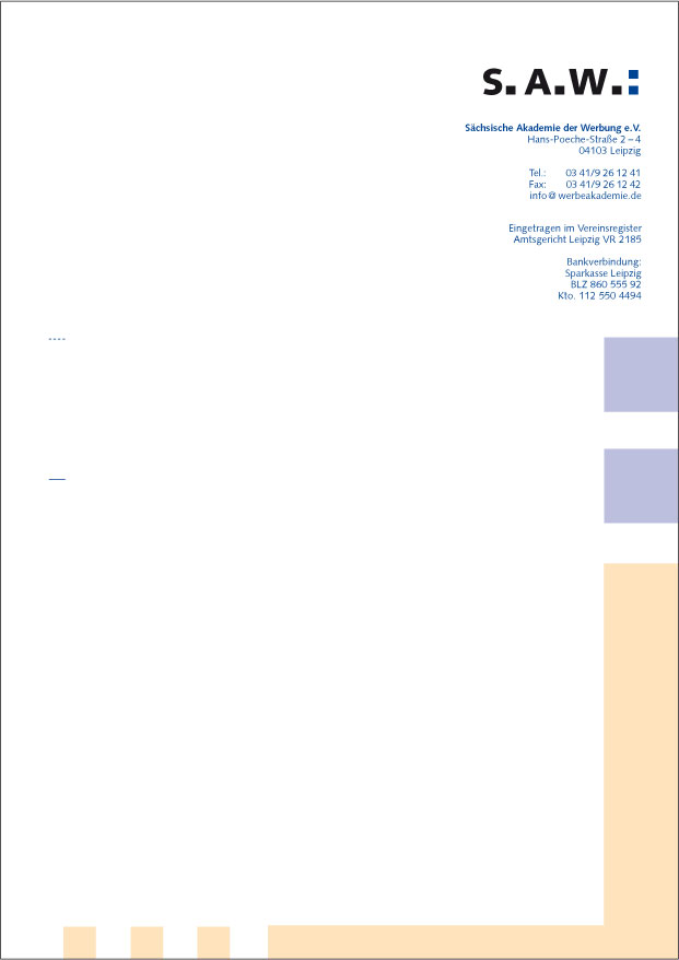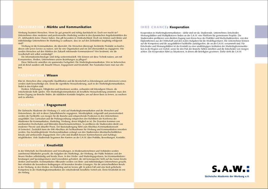 Die Sächsische Akademie der Werbung benötigte ein neues Erscheinungsbild, welches sich von den zuvor verwendeten Druckachen (in dunklen Blau- und Grüntönen) unterscheiden sollte. Ausführung: Das Logo ist als Wortbildmarke konzipiert